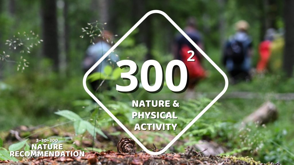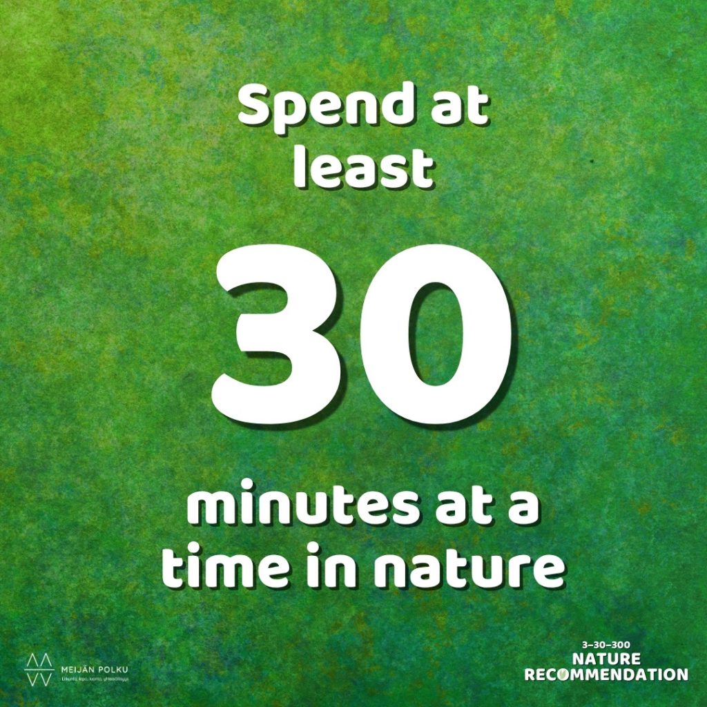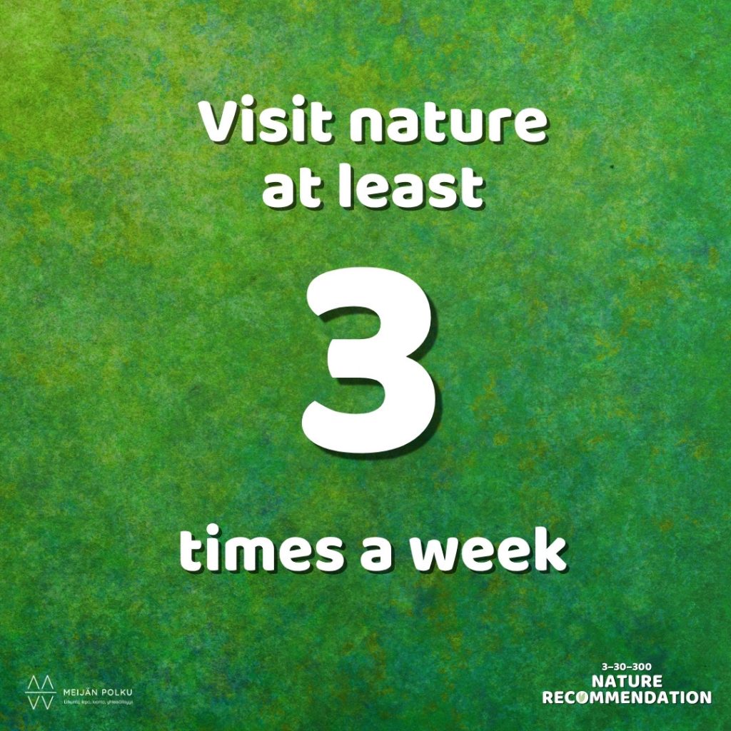 Every moment spent in natural environments offers us various well-being and health benefits. The aim of the 3–30–300 Nature Recommendation is to inspire us to spend time and move in natural environments as often as possible, but at least three times a week. This enables the well-being benefits we get from natural environments, which are based on frequent and regular contact with nature (Tyrväinen, 2023).