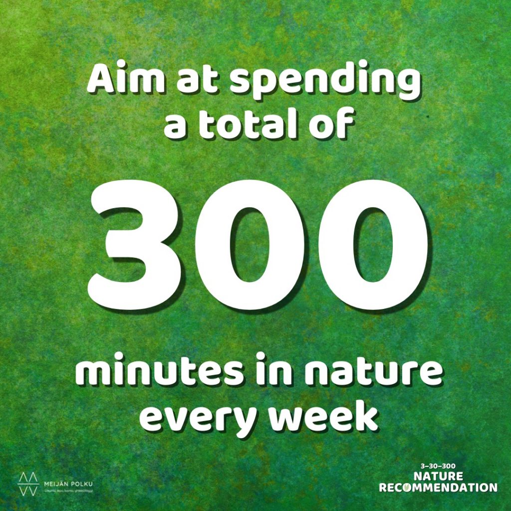 As stated in the 3–30–300 Nature Recommendation, 300 minutes a week would be the optimal goal for the time spent in nature. As the Physical Activity Guideline for adults recommends at least 150 minutes of moderate aerobic activity a week, it also states that for even more health benefits, one should aim for 300 minutes a week.