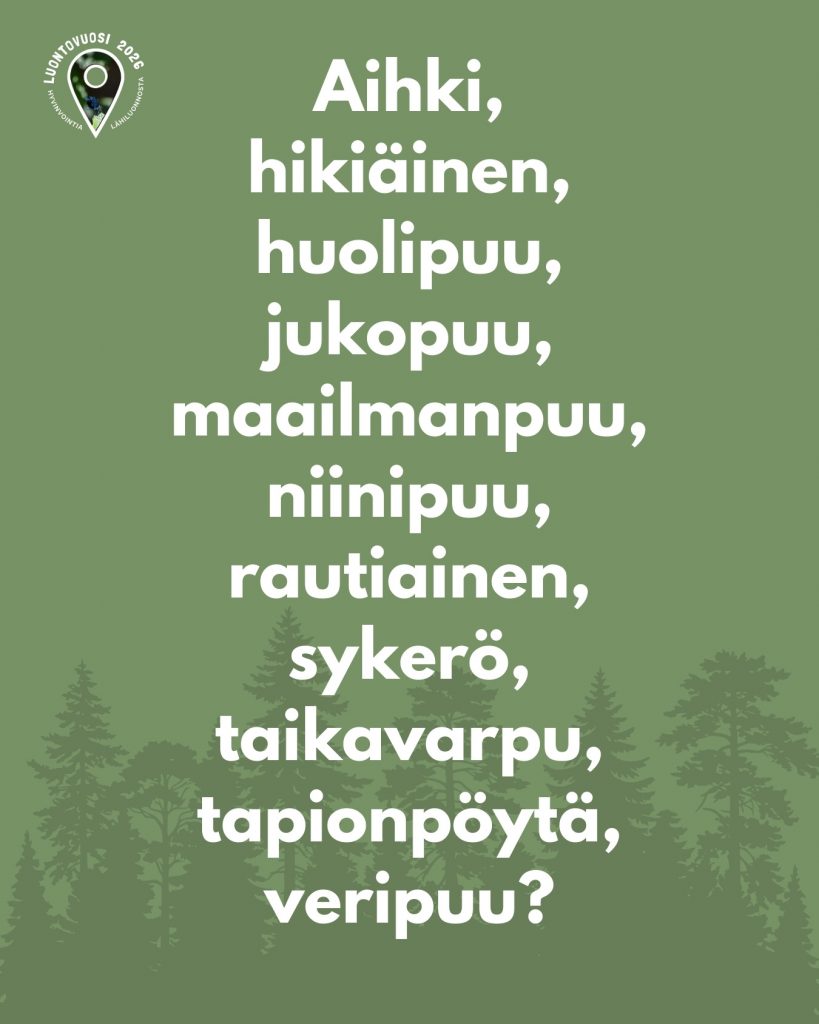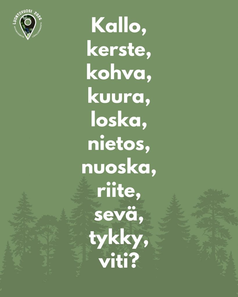 Blogi kuuluu Luontovuoden 2026 julkaisuihin. Luontovuoden tarkoituksena on saada kaikki suomalaiset oleskelemaan ja liikkumaan enemmän luonnossa. Liikkeelle voi lähteä vaikka tutustumalla yllä olevien vihreiden laatikoiden luontosanoihin. Ne kertovat metsistä, puista ja lumesta.