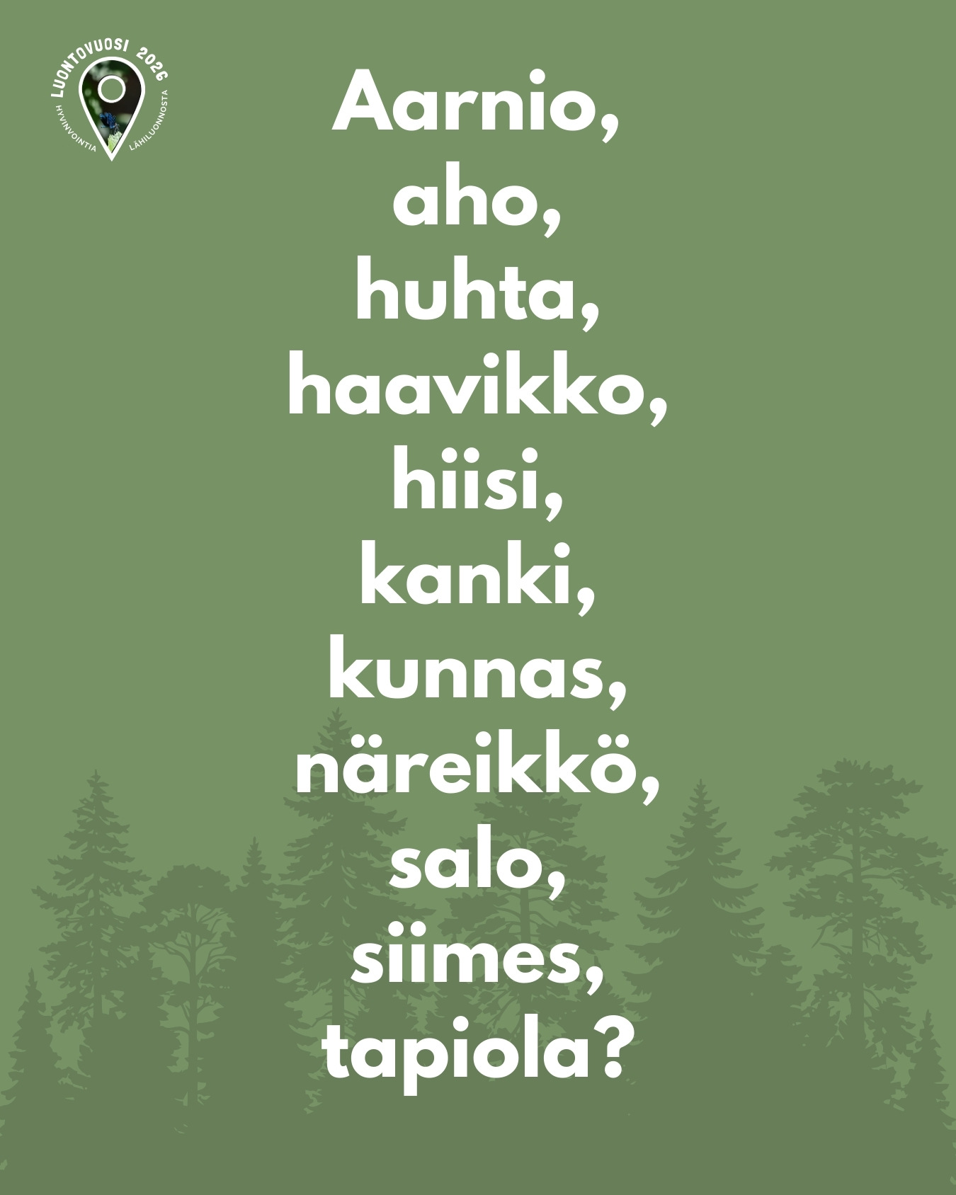 Blogi kuuluu Luontovuoden 2026 julkaisuihin. Luontovuoden tarkoituksena on saada kaikki suomalaiset oleskelemaan ja liikkumaan enemmän luonnossa. Liikkeelle voi lähteä vaikka tutustumalla yllä olevien vihreiden laatikoiden luontosanoihin. Ne kertovat metsistä, puista ja lumesta.