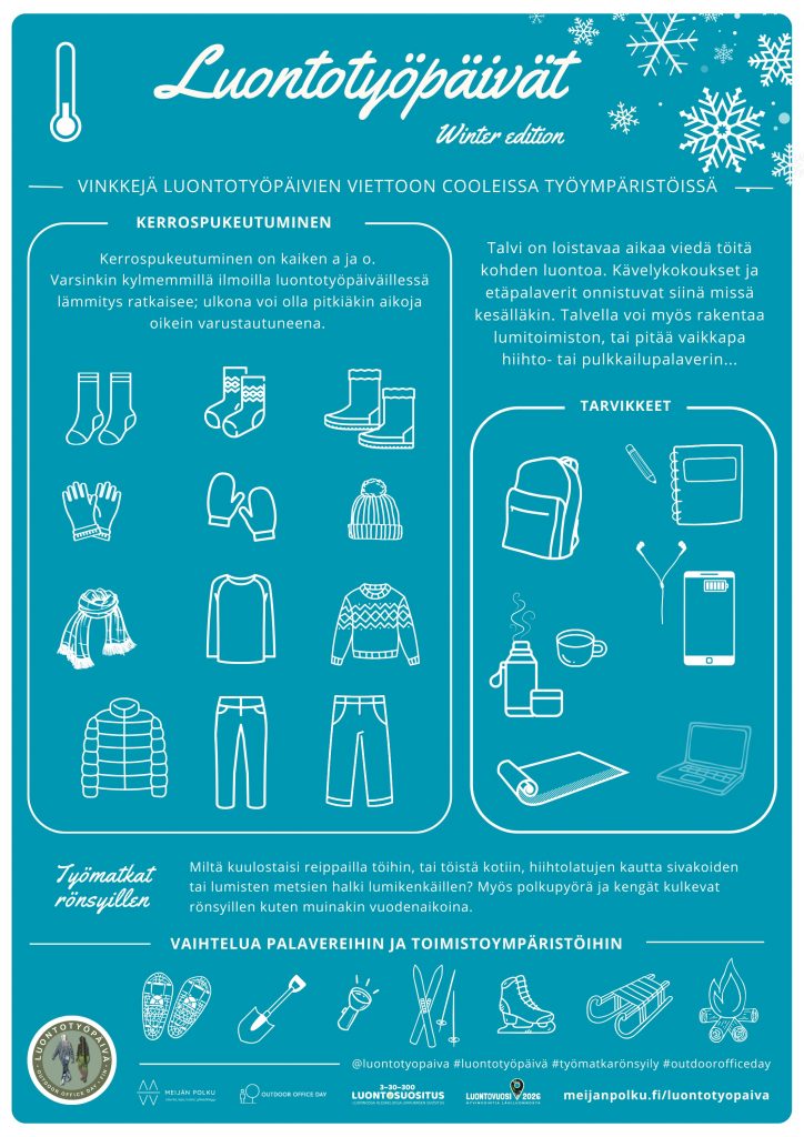 Kun rupeatte luonollistamaan työtänne, ja jaatte kokemuksianne somessa, niin käyttäkää #luontotyöpäivä #työmatkarönsyily ja #outdoorofficeday